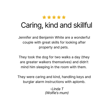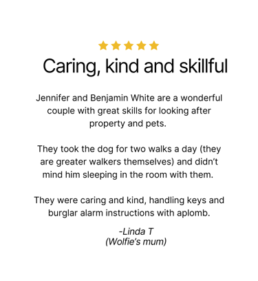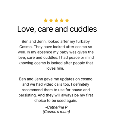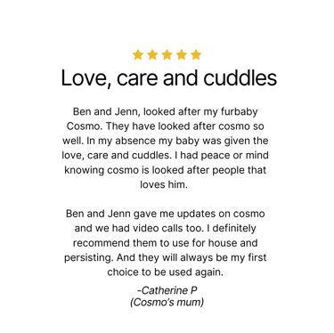 Hi! We’re Ben and Jenn — a Kiwi-Canadian couple who’ve been house and pet sitting our way across New Zealand and Canada for nearly a decade. With backgrounds in business, marketing, and small business ownership (plus a shared love of animals big & small), we've made a lifestyle out of caring for pets and homes as if they were our own.